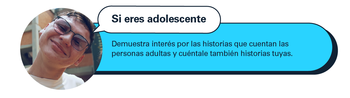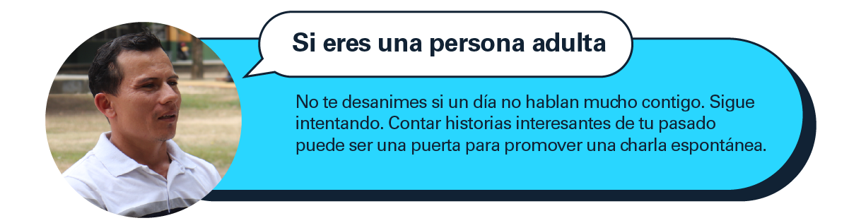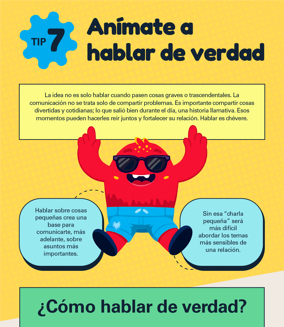 Por ejemplo, si respondes “bien” o “normal” cuando te pregunten cómo te fue en el colegio, agrega una anécdota sobre el día: algo que ocurrió en clase, en el almuerzo, lo que sea. Eso iniciará la conversación. O si eres una persona adulta puedes hablar sobre algo divertido que pasó en el trabajo o en cualquier otra situación.